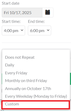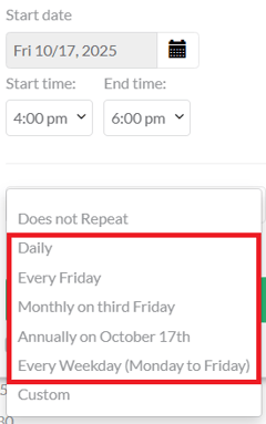 Every (Day of the week) - This repeats your event on the specific day selected. In the example above, the start date is a Friday, which gives you the"Every Friday" option in the drop-down. If your start date is a Thursday, you will have "Every Thursday" to select.