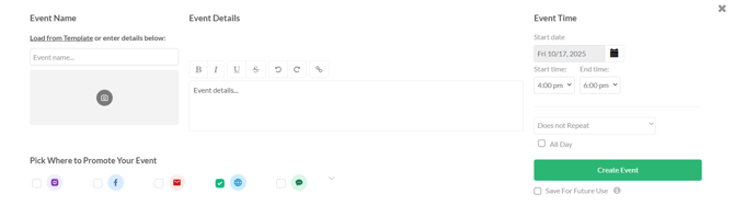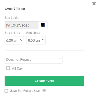 If your event does not repeat, simply choose the date and time and click the green "Create Event" button.