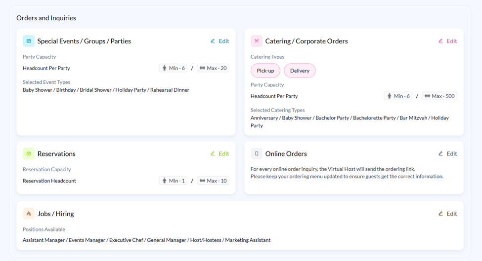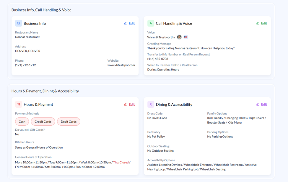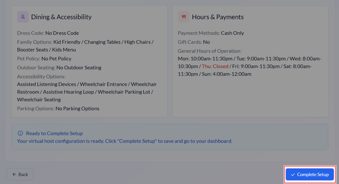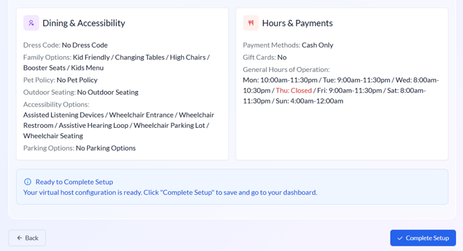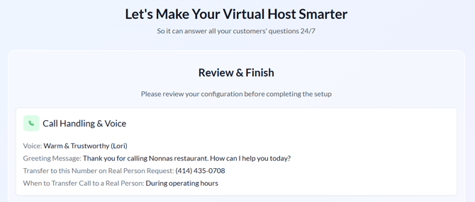 It will guide you through three quick sections to personalize your host’s voice, dining information, and hours, ensuring it can accurately answer your callers’ questions 24/7.
