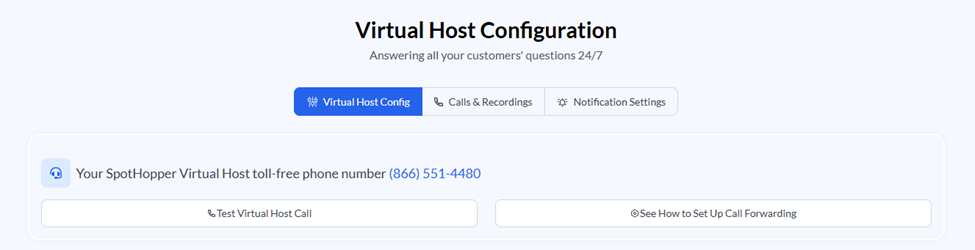 To start using the Virtual Host, log in to your SpotHopper account and select the "Virtual Host" tab from the left-hand sidebar.