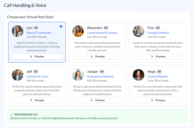 - Click Preview to listen, then select the one that best fits your restaurant’s tone.