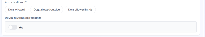 - Indicate if pets are allowed (inside, outside) and whether you have outdoor seating.