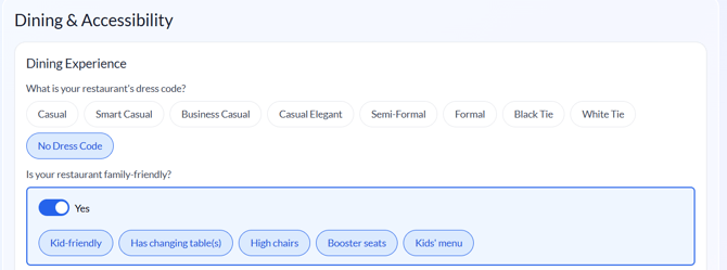 - Toggle Yes if your restaurant is family-friendly and select any relevant options such as High chairs, Kids’ menu, or Booster seats.