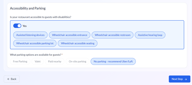 - Choose your parking options (Free Parking, Valet, Paid Nearby, On-Site Parking, or No Parking).