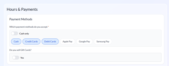 - Check all the payment types you accept — Cash, Credit Cards, Debit Cards, Apple Pay, Google Pay, Samsung Pay.