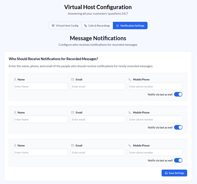 Under the "Notification Settings" tab on the "Virtual Host" page, you can add up to three recipients who will receive notifications for newly recorded messages.