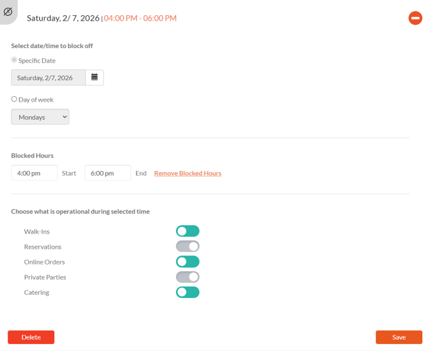 Use this option if certain hours are regularly unavailable on a specific day (for example, no reservations every Monday from 4–6 PM).