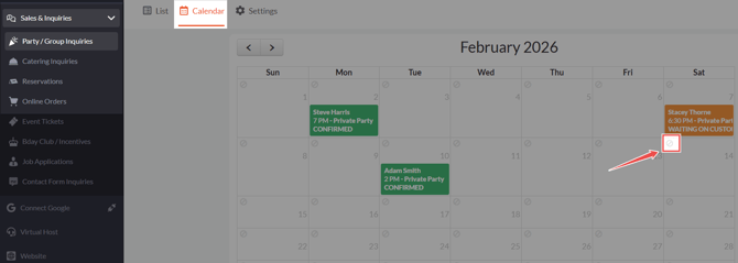 Open any inquiry page (Party Inquiries, Catering, Reservations, Online Orders) under "Sales & Inquiries."