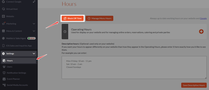Both options open the same Block Off Time settings, where you can block full days, block specific hours, and control which services remain operational.
