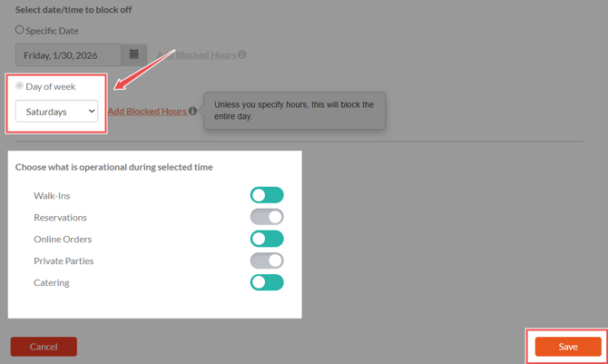 Block an entire day when you want selected services unavailable for the full day. This can be set up as recurring (by day of the week, such as every Saturday) or as a one-time block for a specific date (such as Valentine’s Day).