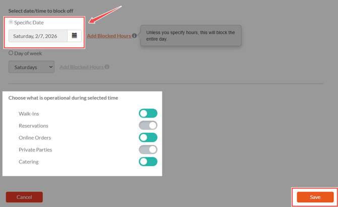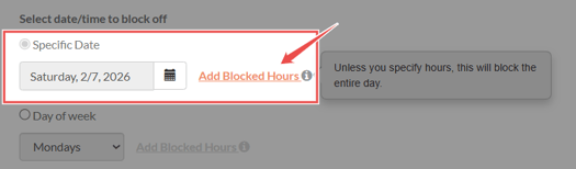 Under the "Specific Date" option, choose the preferred date, then click "Add Blocked Hours" on the right.