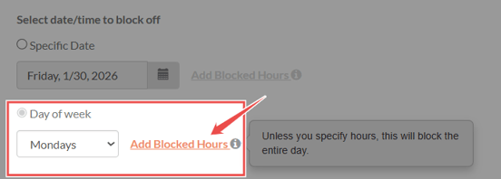 Block specific hours when you only need to limit availability during part of the day, while keeping the rest of the day open. Hour blocks can also be recurring (for example, every Monday afternoon) or one-time for a specific date.