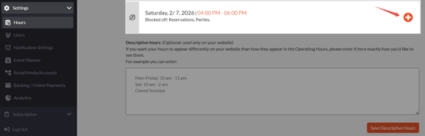 - The existing blocked days/hours will be shown above the descriptive hours box.