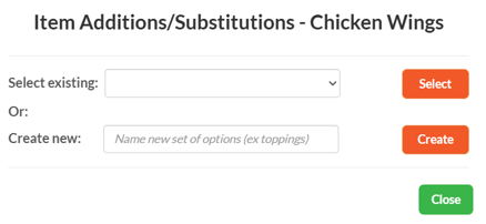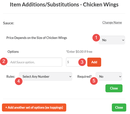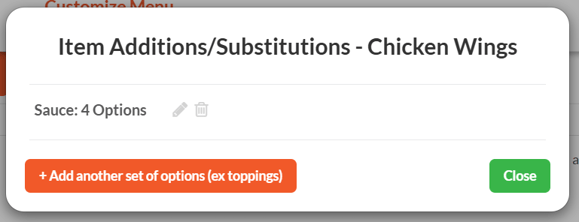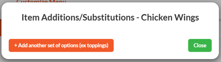 2. On the Items Additions/Substitutions pop-up, click the orange "Add another set of options (ex toppings)" button.