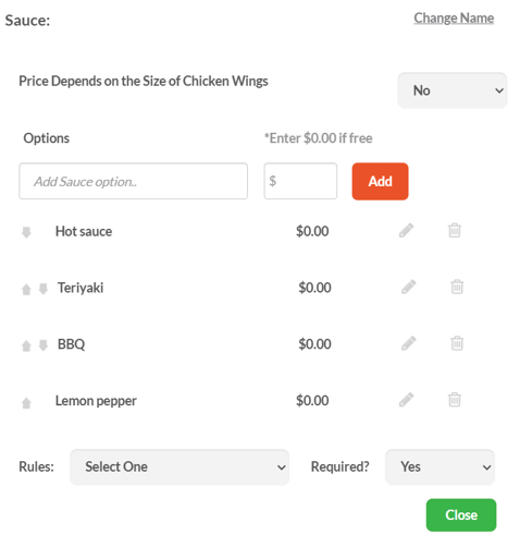 5) Required? - Determines whether the selection from the Rules section is required. If customers must choose a sauce before checkout, set this to "Yes." This ensures they can’t complete the order without making a selection.