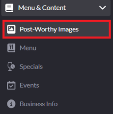 Once your Social Media Accounts are connected, navigate to the "Post-Worthy Images" tab under "Menu & Content" from the left sidebar.