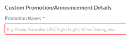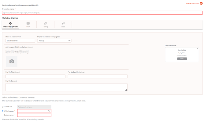 The Promotion Name and Call to Action (CTA) are required fields that apply across all marketing channels — website, email, texting, and social media.