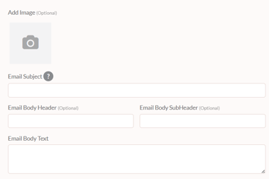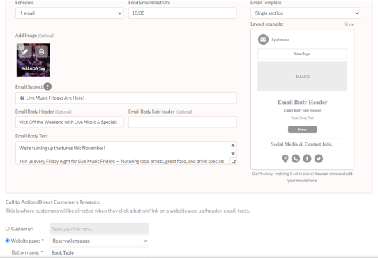 - Add the content of your email blast. That includes an image (optional), email subject, email header & subheader (optional), and email body text.