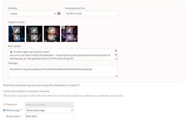 You can schedule up to 6 posts per platform (6 for Facebook and 6 for Instagram), so 12 posts in total. - Be sure to add an image to each post, as social posts can’t be created without a visual.