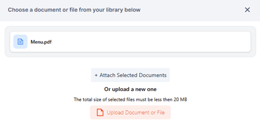 Under Attachments Library, click Upload File to add templates like menus, pricing sheets, or event brochures.