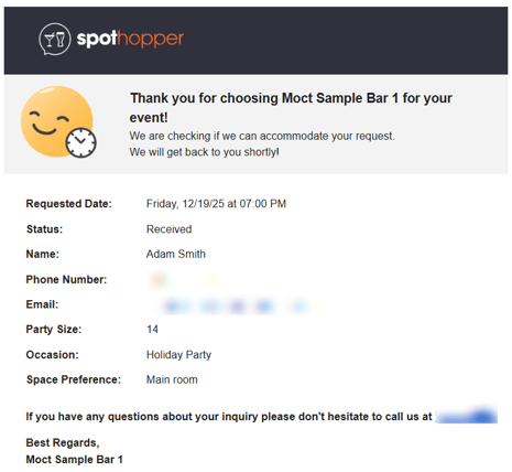 - At the same time, the guest will receive an email summarizing all the information they submitted, along with your venue’s contact details.