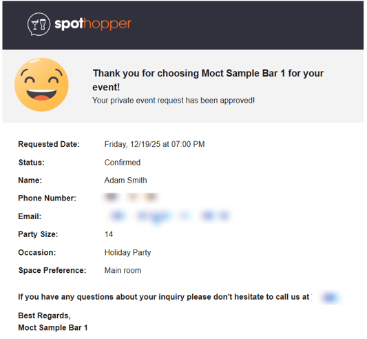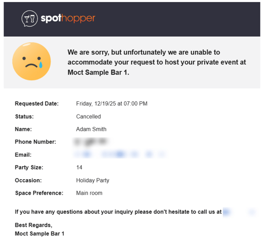Note: As soon as the inquiry is submitted, it appears in your Private Events dashboard, and the inquiry details are also automatically sent to the notification recipients listed on your Parties settings page. - To save you time while managing inquiries, customers will also be sent automatic emails when you change the "status" of their inquiry from the admin: