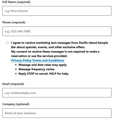 If the texting permission setting is enabled, an opt-in checkbox will appear so that your customers sign up for text marketing. This consent is optional and not required to submit the form.