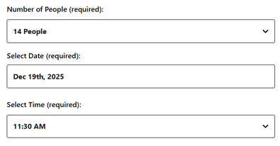 Once your customers visit your Parties page, they’ll see your Private Party Inquiry Form, where they can provide the details needed to plan their event. Most fields are always shown, while a few may vary depending on your settings. The form includes: