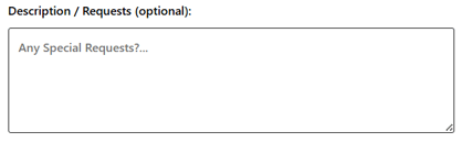 Description/Requests (optional) – An open-text field where guests can share additional information about their event, such as setup preferences, menu requests, or any specific requests they may have.