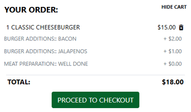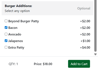 If a menu item includes extra options or required choices, customers will be prompted to make those selections when they click "Add to cart."