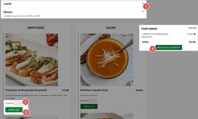Within an open menu, they may also see menu sections (if any are set up), like Appetizers, Soups, or Entrees. Each section includes the individual menu items available for the order type and time the customer selected.