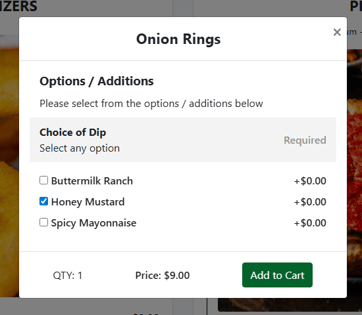 For example, in the screenshot below, the Onion Rings come with a choice of dip. When the customer adds Onion Rings to their cart, a pop-up appears prompting them to choose their preferred dip.