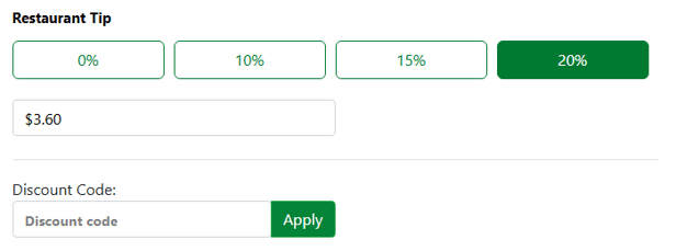 Below the tip area, customers will see a Discount Code field. If they have received a promo code through one of your incentives, they can enter it here to reduce their order total.