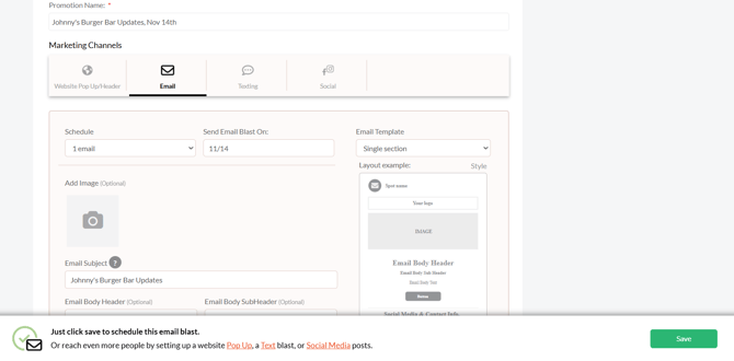You can also create email blasts as part of a multi-channel promotion. To send more than just an email, check out our Creating Custom Promotions article. The setup process is almost the same, but you’ll use the Next button to move through additional channels instead of clicking Save after completing the email details.