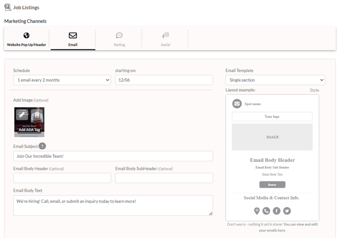 Include your image (optional), email subject, header/subheader (optional), and email body text.