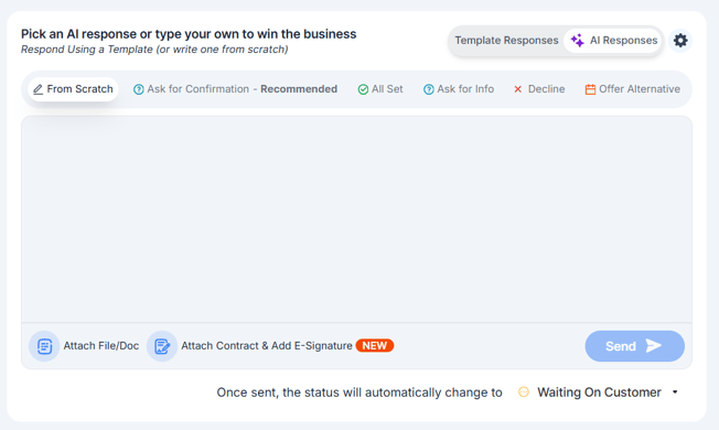 Each AI/Template response is tied to a preset status. When you send a response, the inquiry’s status will automatically update to the corresponding value (for example, Waiting on Customer or Confirmed).