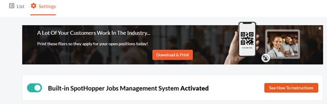 3. The toggle at the top of the Settings page should be turned on and read "Built in SpotHopper Jobs Management System Activated."