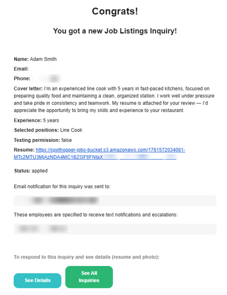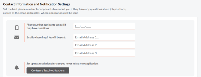 Email Recipients - Add the email addresses that will receive notifications for inquiries. You can add up to three email notification recipients - perfect if multiple managers handle hiring.
