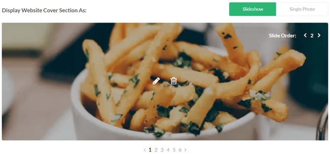 Slideshow: Multiple images will rotate within your cover section. You can replace an existing image using the edit (pencil) icon or remove a slide using the trash icon. You can also adjust the order of the slides using the "Slide Order" controls in the upper-right corner of the image.