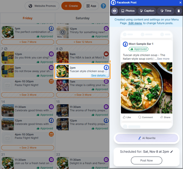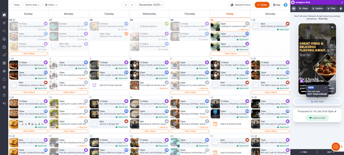 You will find all of the scheduled social media content - including posts, reels, stories, and fliers - on the calendar page. Clicking any post, whether it’s approved or still pending, will open a detailed preview panel on the right side of the screen.