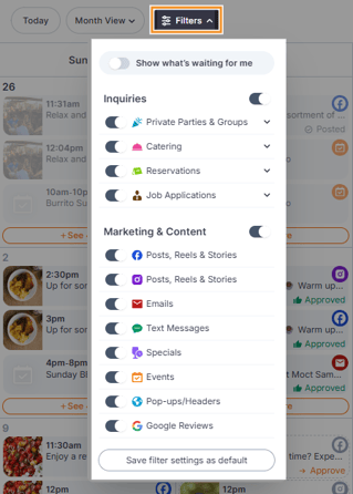 The Filters menu lets you control which calendar items appear on your calendar. Within the Filters panel, you can toggle on or off specific categories under two main sections: