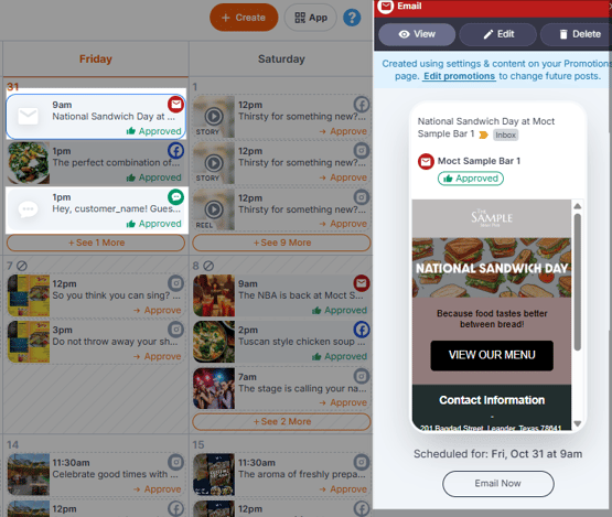 Just like social media posts, clicking any email or text item on the Calendar page opens a detailed preview panel on the right. From there, you can click Edit to make changes — this will take you to the full Email or Texting preview page, where you can customize the message.