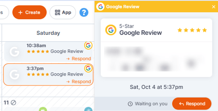 Your google reviews will also show on the calendar. You will also have a Respond button, that will take you to your Google & Reviews page, from where you can respond to your reviews with just a couple of clicks.