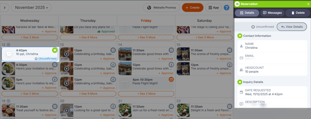 All scheduled marketing content, events, specials or inquiries appear on the calendar page.