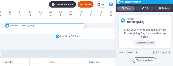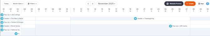 When the Pop-Up/Header option is enabled in your Filters, a "Website Promos" button appears next to the Create button in the top-right corner of the calendar.