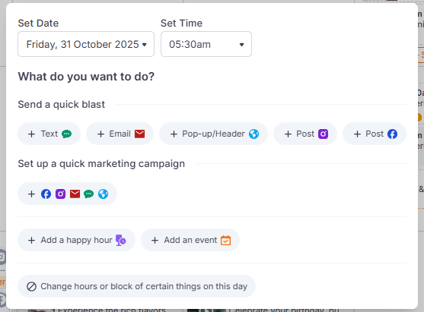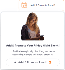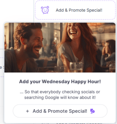 We love helping you stay top of mind! If we notice your calendar isn’t fully scheduled, you may see a friendly nudge or reminder suggesting you add a special or event. These prompts are designed to help you fill open dates and make sure your customers always have something new to look forward to.