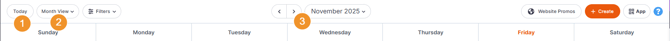 - Month/Week Selector – Click the month in the center (e.g., November 2025) to navigate to a different month or week. You can also use the arrow buttons on either side to move forward or backward by one month or week, depending on your current view.
