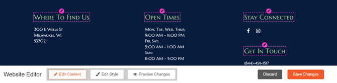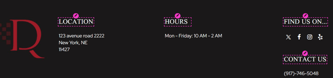 Information like hours, address, phone number, social icons, etc. should be updated from their respective page on the platform.