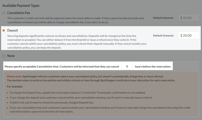 3. Under the Available Payment Types, choose "Deposit" and enter the default deposit amount you want to capture from your guests.