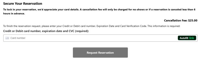 When making a reservation, your guests will be prompted to add their credit card details. Please note that their payment info will only be captured, and they won't be charged any fee at this stage.
